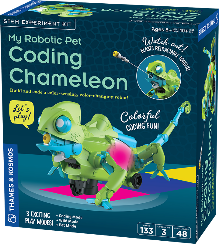 Build your own robotic chameleon that changes colors, shoots its tongue, and responds to your gestures! Use colorful action cards to program fun moves in three play modes: coding, wild, and pet. Watch it blend with its surroundings, stalk pretend prey, or show affection as it walks around. This 15-inch model moves like a real chameleon and teaches you about robotics and nature’s designs—all without screens!