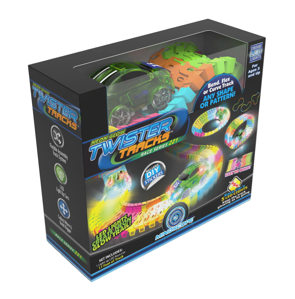 Enjoy 11 feet of neon glow track in five colors and a light-up race car that leaves glowing trails. Add your own stickers and snap the flexible pieces together to build endless track shapes.